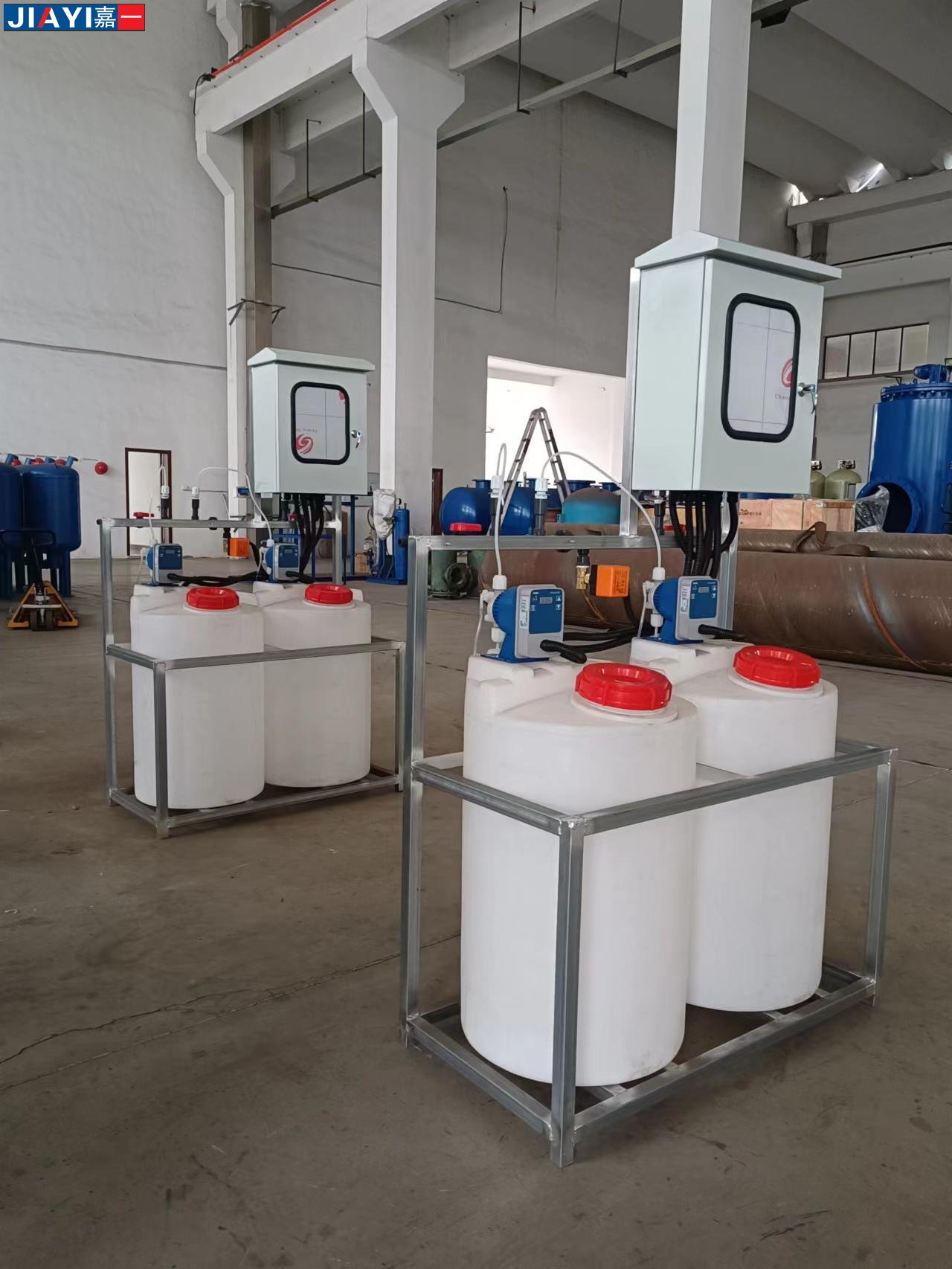 全自動加藥裝置采用時間程序控制,此控制方式無需儀表的支持,首先根據系統的運轉需要設定自動加藥的周期、加藥量、加藥時間和加藥頻率。在以后的系統運轉過程中,到加藥周期,計量泵自動打開加藥,加到規定的時間計量泵關閉;到排污周期,計量泵停止加藥,排到規定的時間后,計量泵繼續開啟,補充排污損失掉的藥劑,把系統的含藥量維持在正常的水平、加到規定的時間計量泵關閉。
